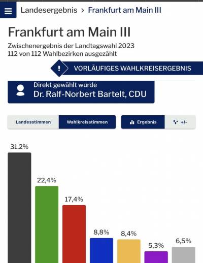 Die CDU Dornbusch freut sich, dass Dr. Bartelt die Interessen des Frankfurter Nordens weitere fünf Jahre wird in Wiesbaden vertreten können. Gleiches gilt natürlich für das herausragende Ergebnis der CDU Hessen bei der Landtagswahl und die damit eröffnete Möglichkeit, dass der aus Frankfurt und dem Dornbusch stammende Ministerpräsident, Boris Rhein, weitere fünf Jahre die Geschicke unseres Bundeslandes wird leiten können.